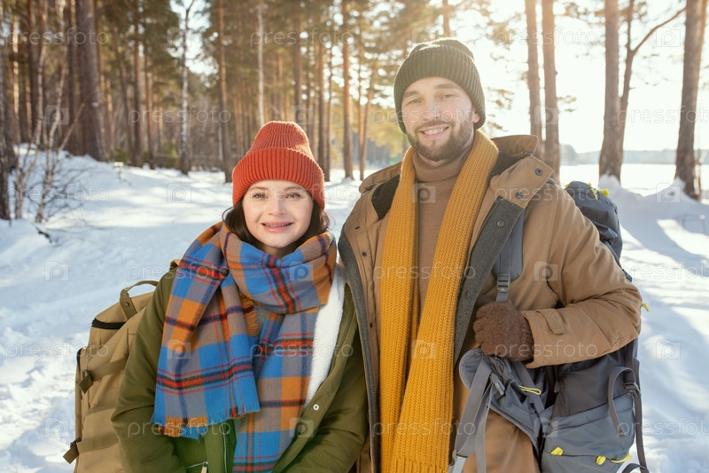 Молодая улыбающаяся пара в зимней одежде стоит перед камерой в лесу