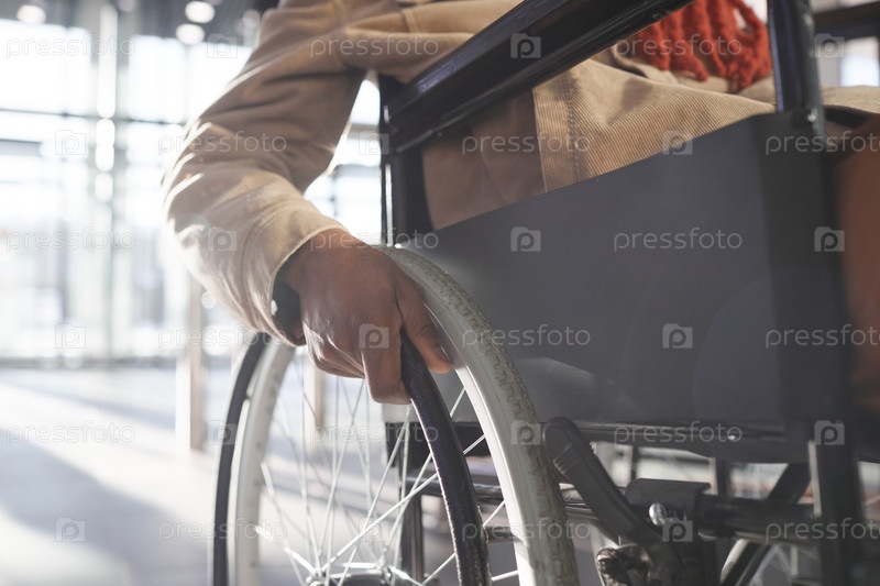 Человек, поворачивающий колеса инвалидной коляски Close Up