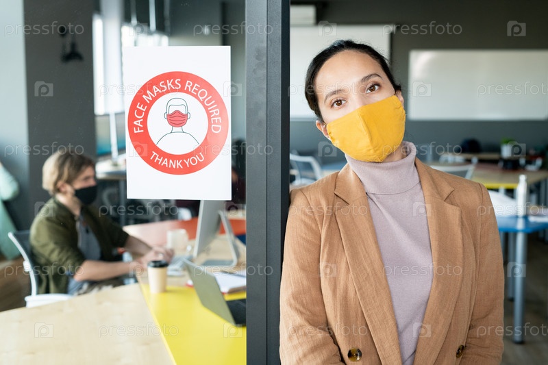 Молодая офисная работница смотрит на вас, прислонившись к объявлению