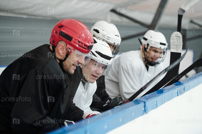 Группа хоккеистов в спортивной форме, слушающих своего опытного тренера