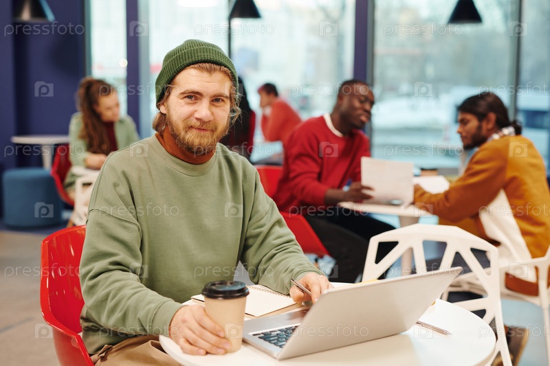 Серьезная бородатая бизнес-леди со стаканом кофе, смотрящая на дисплей ноутбука
