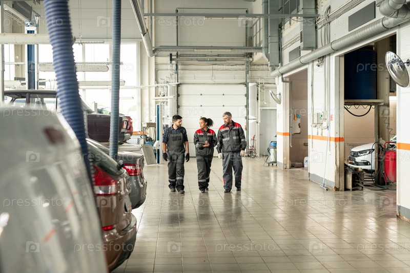 Три межкультурных работника центра технического обслуживания автомобилей движутся вдоль мастерской