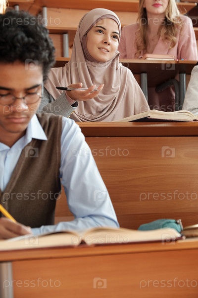 Молодая красивая студентка в хиджабе сидит за столом во время лекции и смотрит на учителя