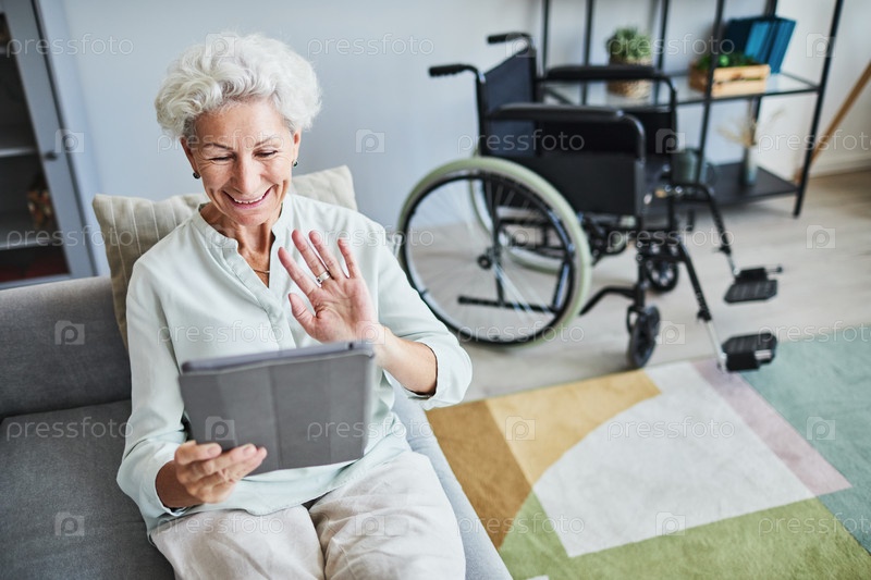 Улыбающаяся пожилая женщина использует планшет