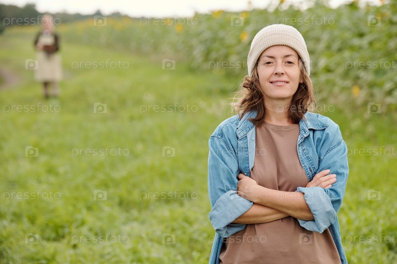 Зрелая веселая фермерка в шапке и рабочей одежде смотрит на тебя с улыбкой