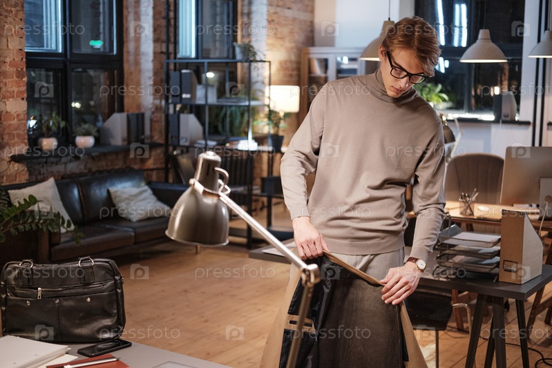 Красивый молодой офисный сотрудник снимает куртку со заднего сиденья при выходе из офиса ночью