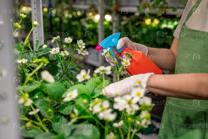 Человек в перчатках и фартуке поливает растения на вертикальной ферме