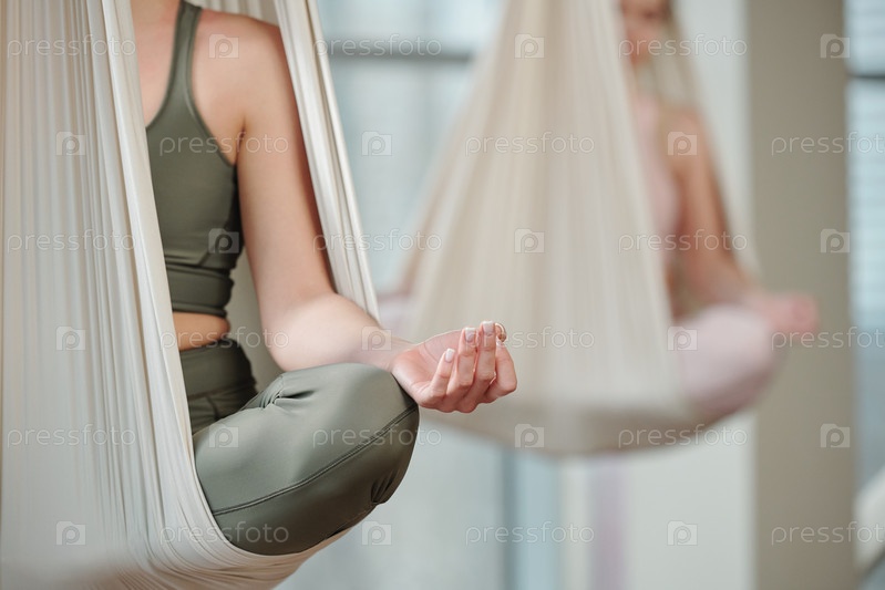 Рука молодой спокойной женщины в спортивном костюме, сидящей в позе лотоса на белом летящем гамаке для йоги