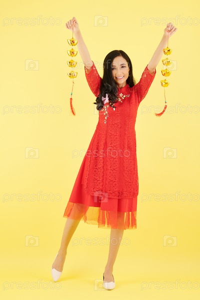 Женщина с гирляндами счастливых золотых слитков