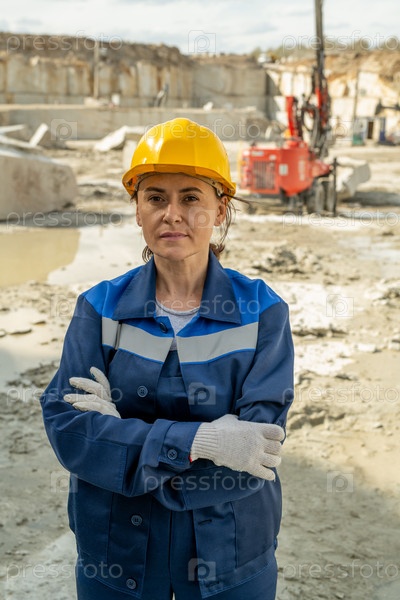 Молодая серьезная женщина-строительница в рабочей одежде