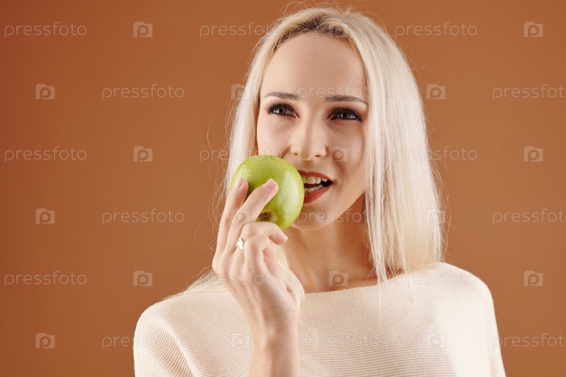 Женщина кусает зеленое яблоко