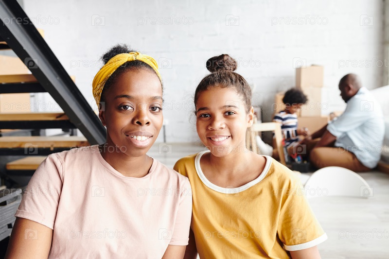 Счастливая молодая африканская женщина и ее очаровательная дочь сидят на лестнице, мужчина и маленький мальчик