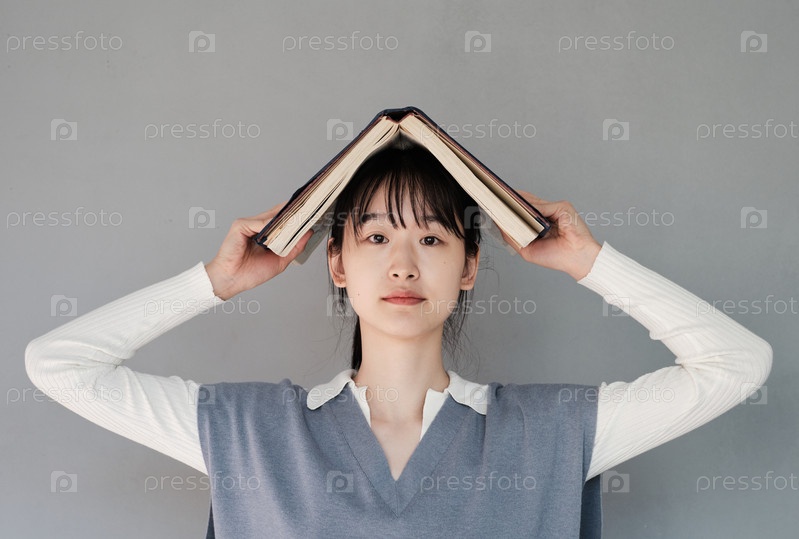 Портрет серьезной азиатской студентки-студентки с фреском, стоящей с книгой на голове на сером фоне