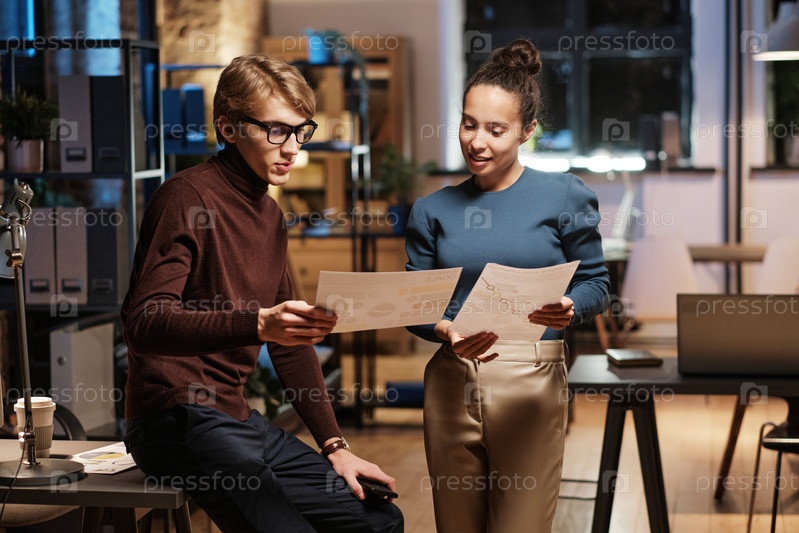 Контент молодых многонациональных коллег, анализирующих графики при работе с документами в офисе ночью