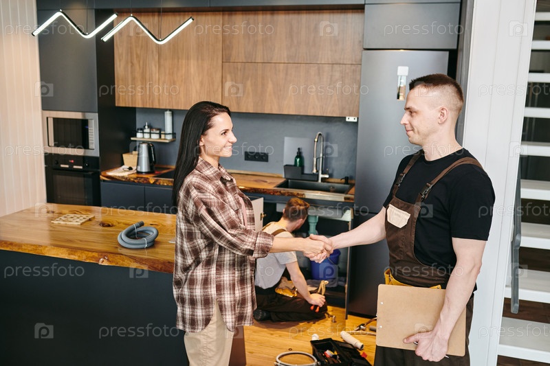 Счастливая молодая женщина, пожавшая руку сантехнику