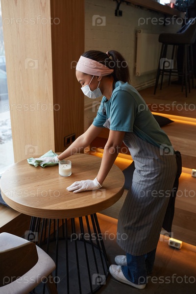 Женщина-работница, убирающая столы