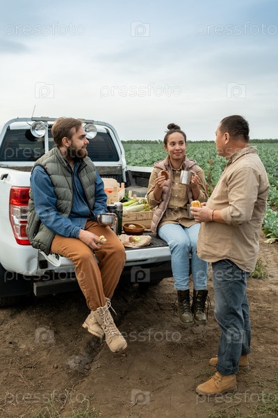 Трое фермеров обедают на багажнике машины против поля капусты