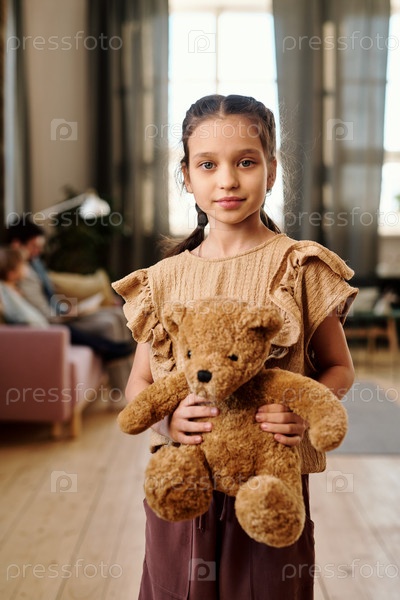 Красивая девочка с мягким коричневым медвежонком смотрит на тебя против своей семьи