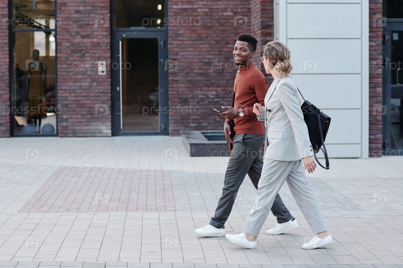 Две молодые коллеги взаимодействуют, передвигаясь вдоль современного бутика