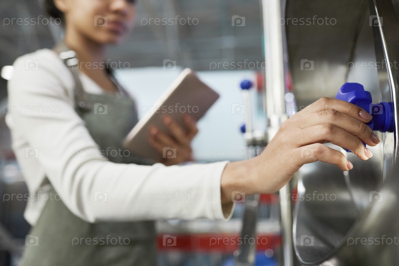 Женщина-работница открывает клапан на фабрике Close Up