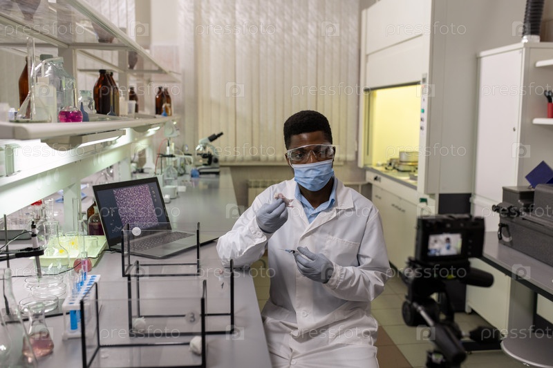 Молодой ученый в защитной маске, перчатках и лабораторном пальто тестирует новую вакцину