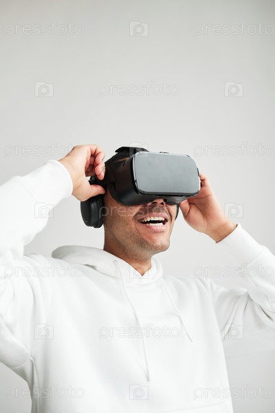 Молодой человек использует VR на белом