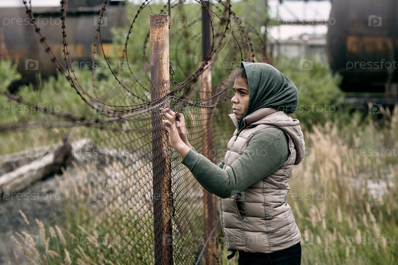 Бездомная девушка в повседневной одежде стоит у забора из колючей проволоки