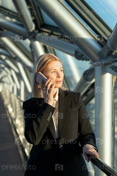 Зрелая представительница или деловая женщина в формальной одежде, разговаривающая по мобильному телефону