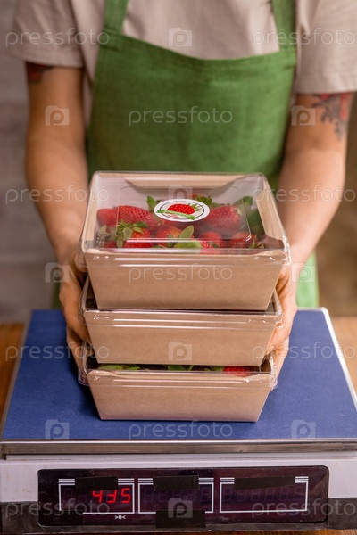 Руки молодого вертикального фермерского рабочего, держащего кучу контейнеров со свежими спелыми клубниками
