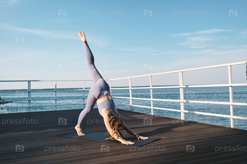 Молодая активная самка сгибается вперед, держа левую ногу поднятой