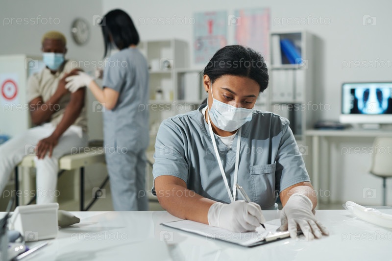 Молодой врач смешанной расы в защитной рабочей одежде сидит за столом и заполняет документы