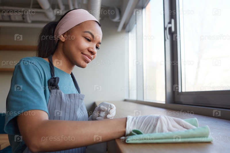 Улыбающаяся женщина моет окна