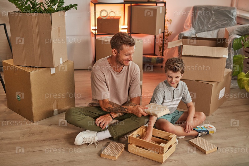Отец и сын распаковывают коробки в новом доме