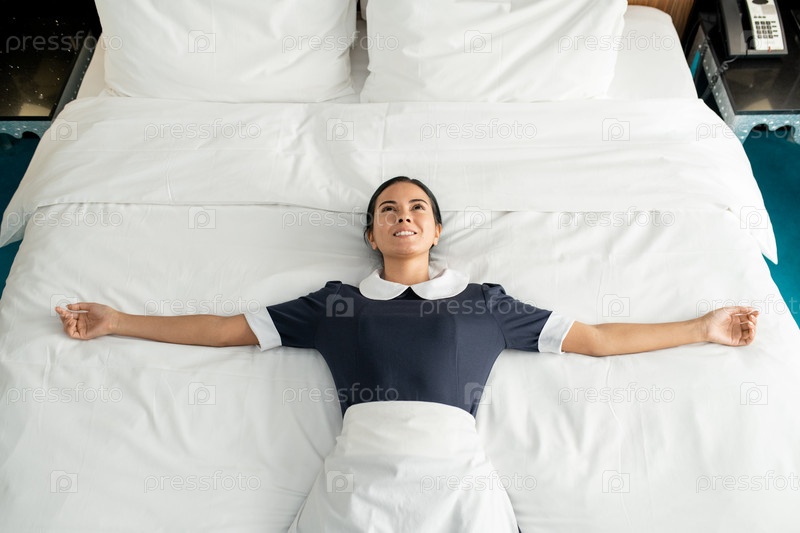 Молодая веселая и расслабленная горничная с зубчатой улыбкой лежала на чистой и переодеваемой кровати