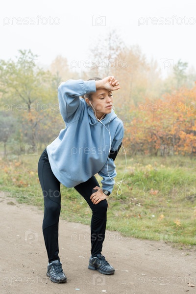 Уставшая девушка, стоящая со скошенными коленями на тропинке после тренировки и касающаяся лба