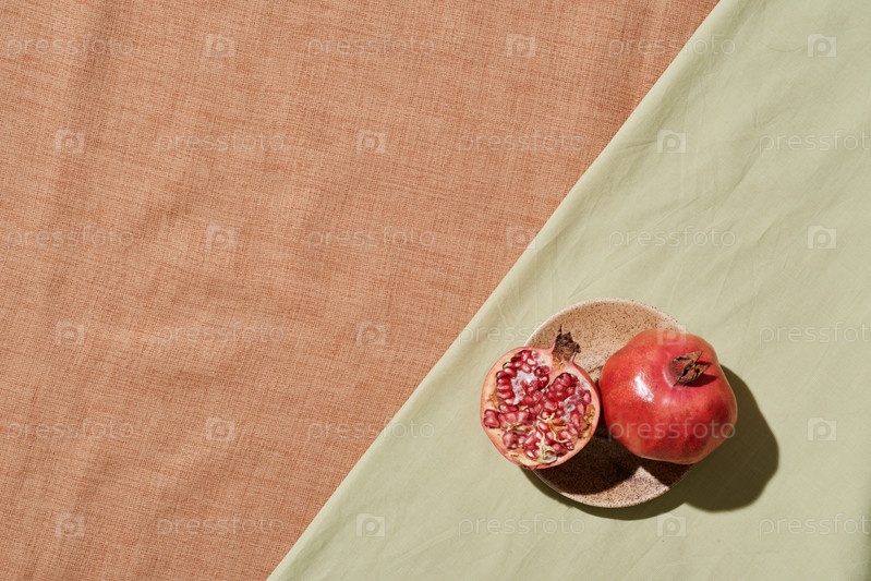 Высокоугольный взгляд на свежий гранат и его кусок на керамической пластине, помещенной на скатерть