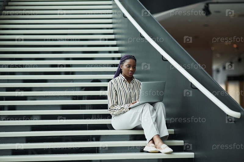Молодая бизнесвуменка использует ноутбук в офисной вестибюле