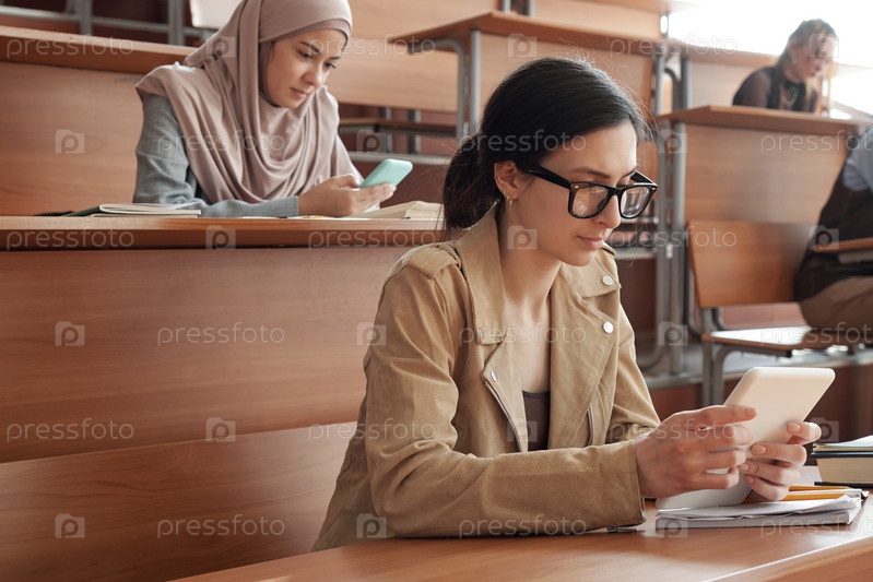 Современные молодые межкультурные студенты сидят за столами в лекционном зале и используют мобильные гаджеты