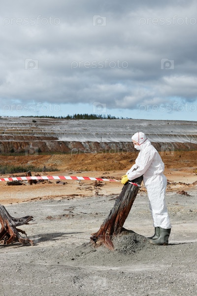 Ученый-эколог в белой защитной одежде и резиновых сапогах обертывает баррикадную ленту вокруг мертвого ствола дерева на заброшенной территории