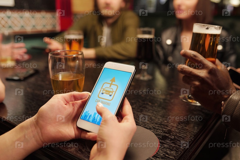 Рука молодой женщины со смартфоном над столом, которая собирается вызвать такси