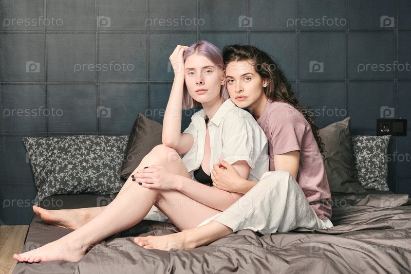 Серьезные женщины обнимаются в постели