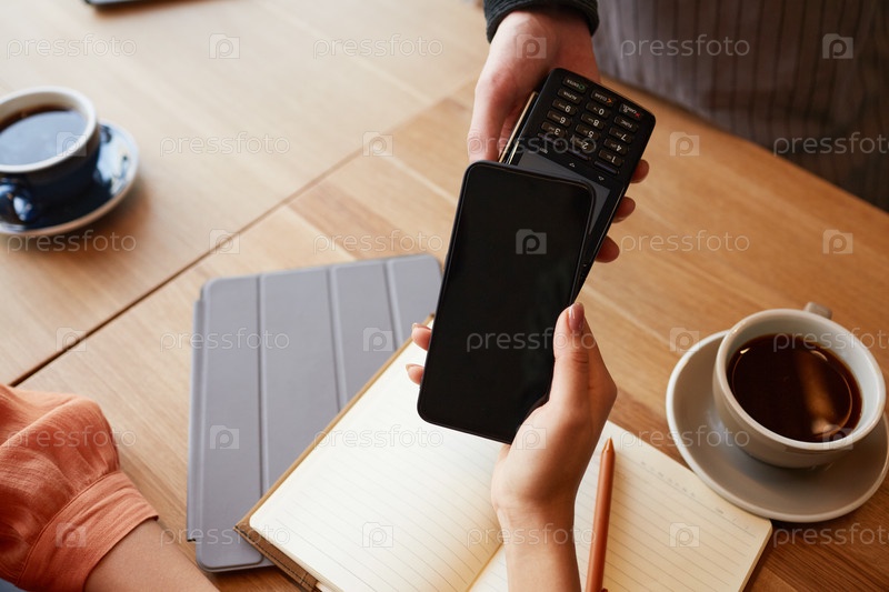 Клиент оплачивает с помощью смартфона в кафе