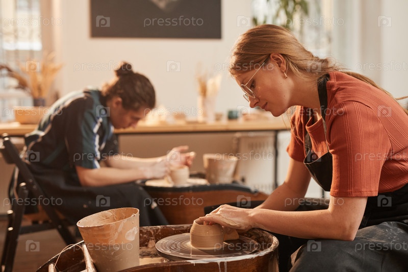 Молодая женщина делает изготовленную вручную керамику