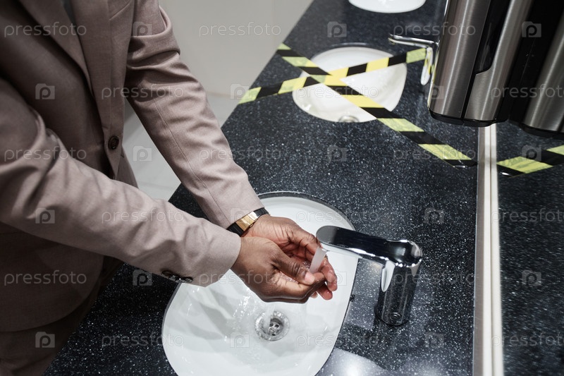 Бизнесмен моет руки в общественном туалете