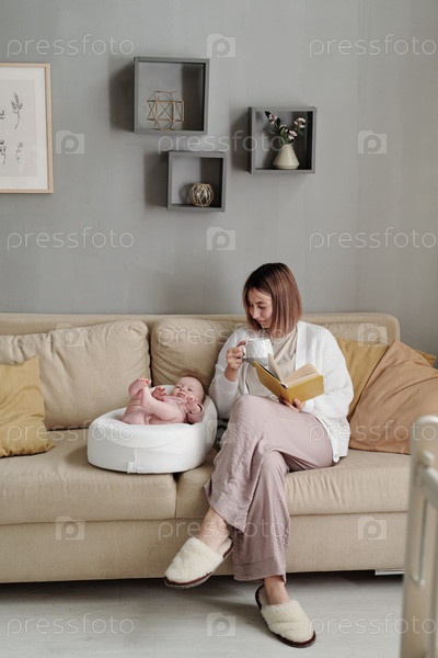 Молодая женщина с чашкой чая и книгой сидит на диване рядом со своей маленькой дочерью