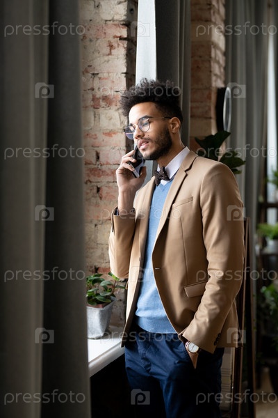 Уверенный бизнесмен смешанной расы, разговаривающий по телефону
