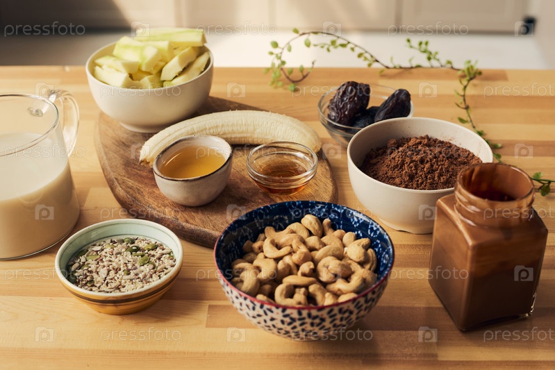 Группа мисок и банок с ингредиентами для смузи