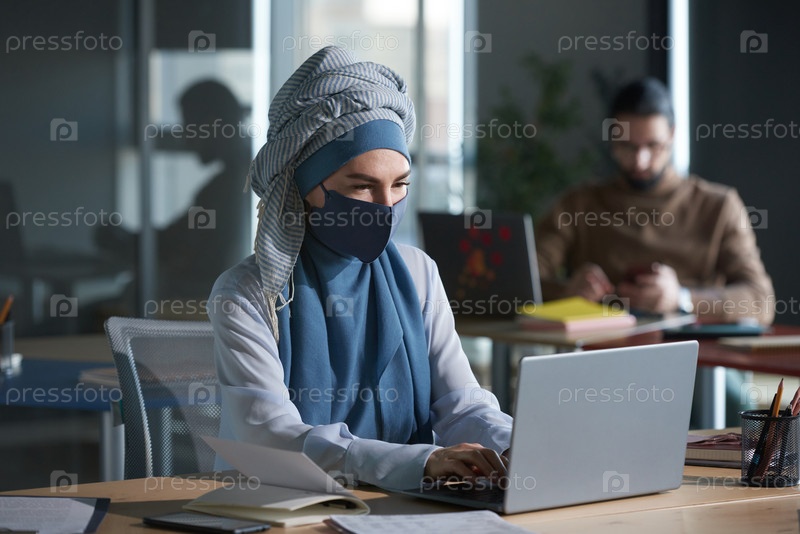 Мусульманка в маске работает в офисе