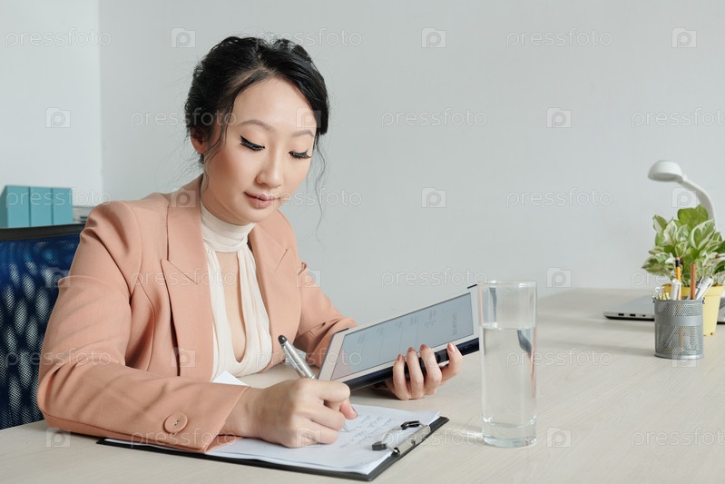 Молодая бизнесвумен заполняет форму резюме
