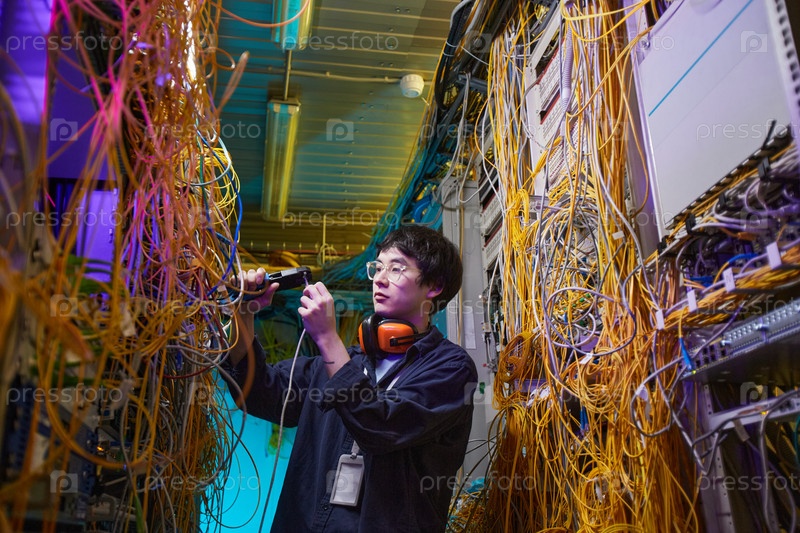 Техник, осматривающий серверную комнату